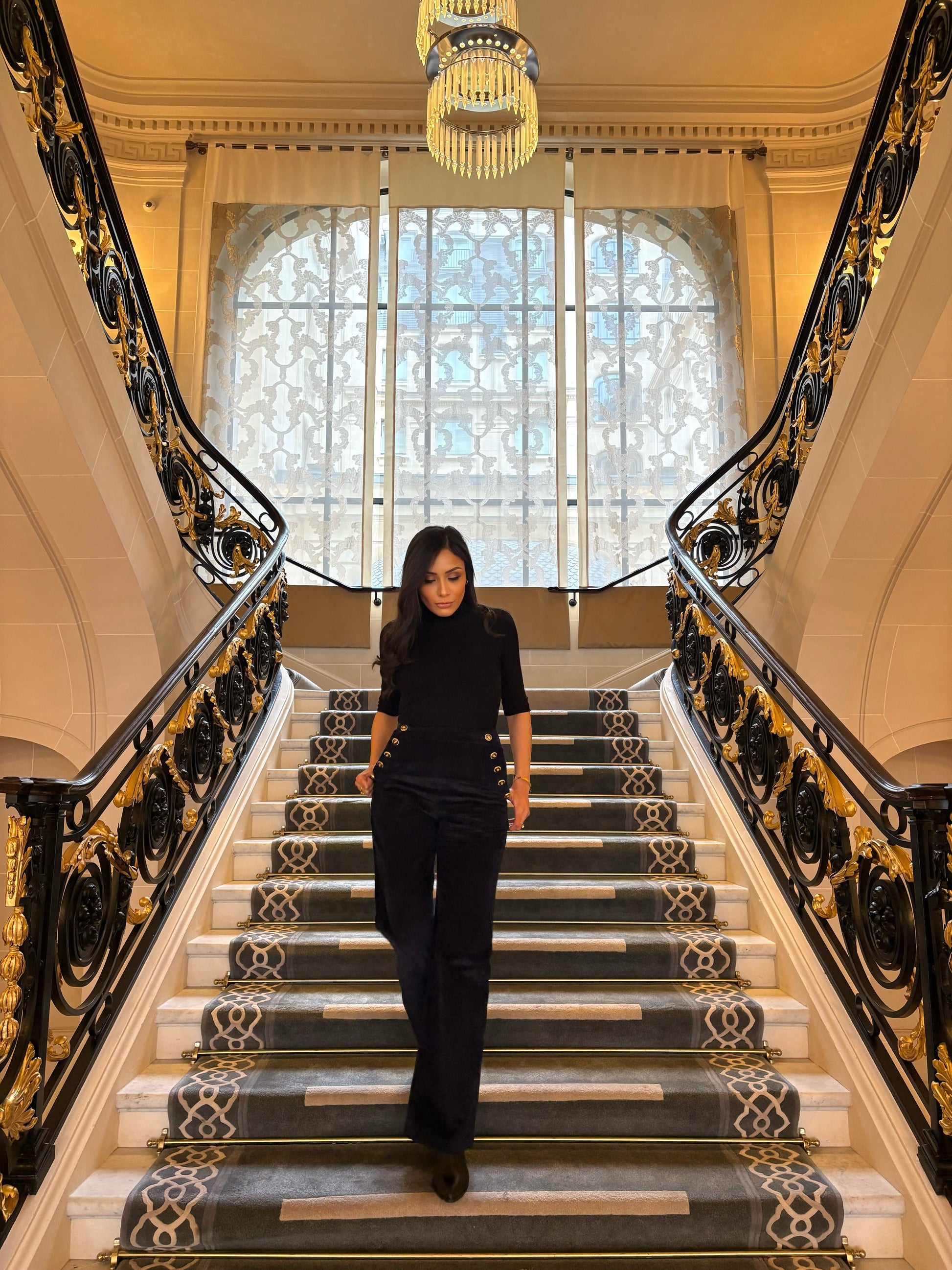 Pantalon en velours côtelé à taille haute, doté d’une coupe évasée élégante qui allonge la silhouette. Idéal pour l’hiver, il est confectionné dans un velours issu d’une grande maison de luxe, offrant à la fois douceur et tenue. Les boutons dorés raffinés soulignent la taille et apportent une touche sophistiquée.